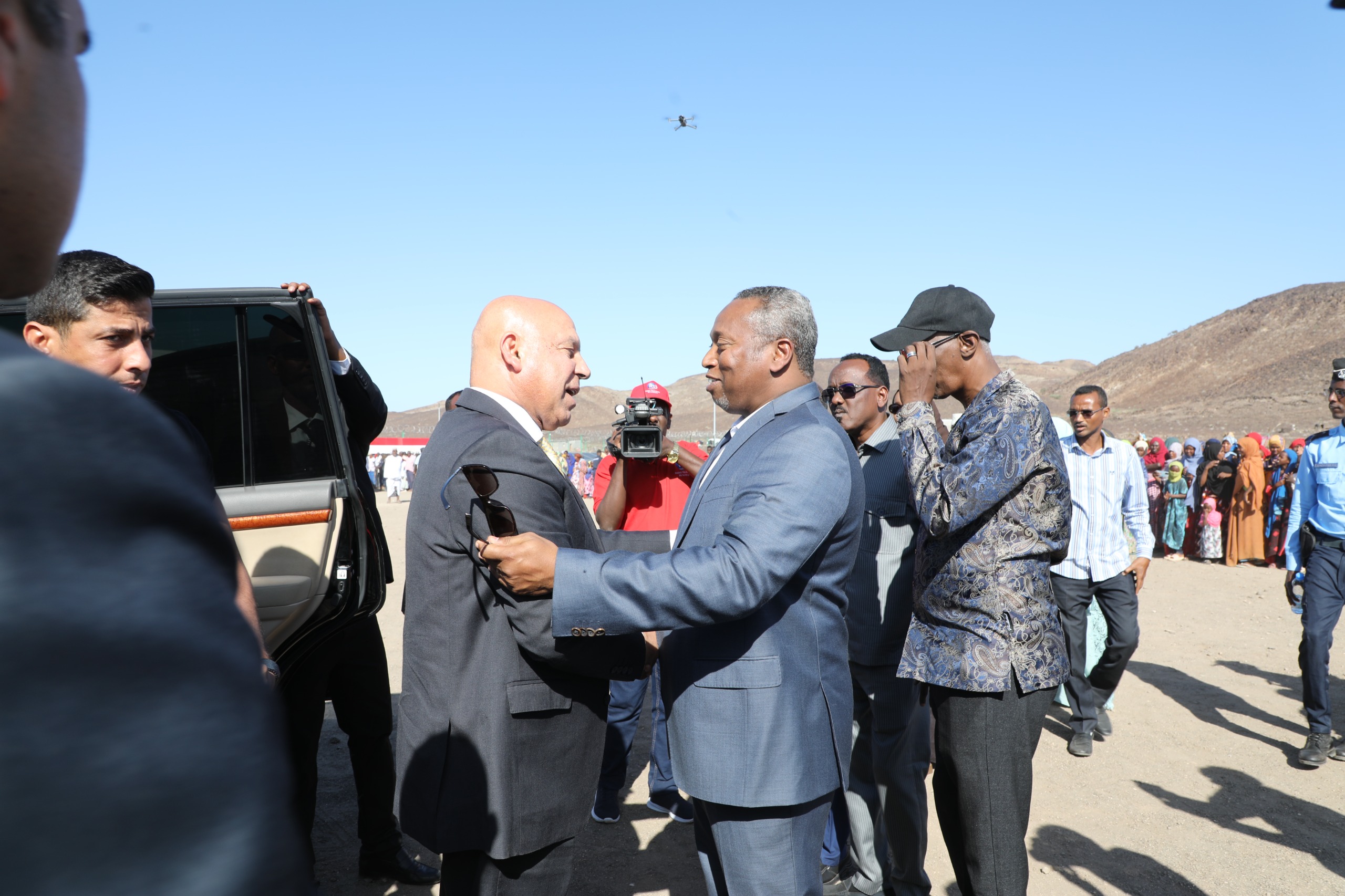 À son arrivée dans la localité, la délégation égyptienne a été accueillie chaleureusement et en grande pompe, dans la joie et l'allégresse, par le Ministre de l’Energie, chargé des Ressources Naturelles, Son Excellence Monsieur Yonis Ali Guedi, le Préfet de la région, M. Hassan Dabaleh Ahmed, le président du Conseil Régional d’Arta, M. Elmi Bouh Goudadeh, les parlementaires de la région, les autorités civiles et militaires et par une foule nombreuse, composée des habitants d’Omar Jaggaa (dont des notables, des Okals, des hommes, des femmes et des jeunes), rassemblée sur le site abritant l’infrastructure énergétique.