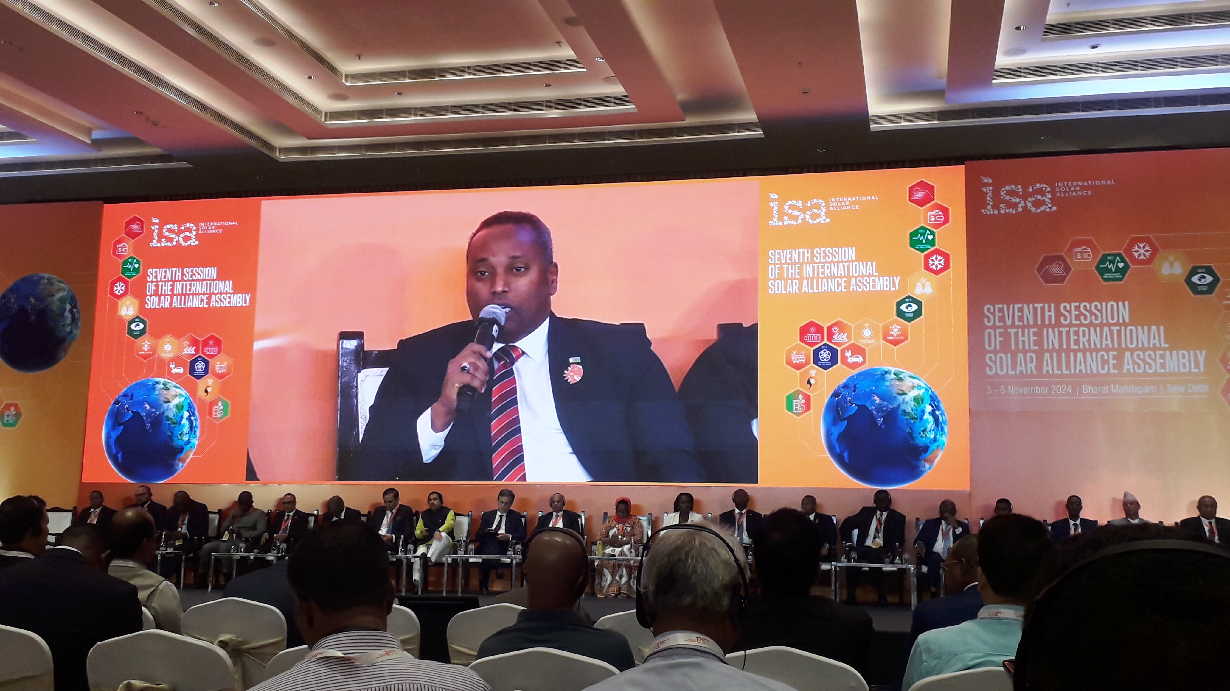 La cérémonie solennelle d'ouverture de la plénière ministérielle a été présidée par le nouveau Ministre indien des Énergies Nouvelles et Renouvelables, Son Excellence Monsieur Pralhad Venkatesh Joshi. Elle débuta par une présentation du Directeur Général de l'ISA des activités réalisées et des projets financés par l'Alliance au cours de l'année 2024. Plusieurs pays, choisis parmi ceux qui se sont les mieux illustrés pour les efforts menés en matière de déploiement de l'énergie solaire dont notre pays, la République de Djibouti, ont été félicités et récompensés par la remise des trophées au Ministre par les dirigeants de l'ISA.